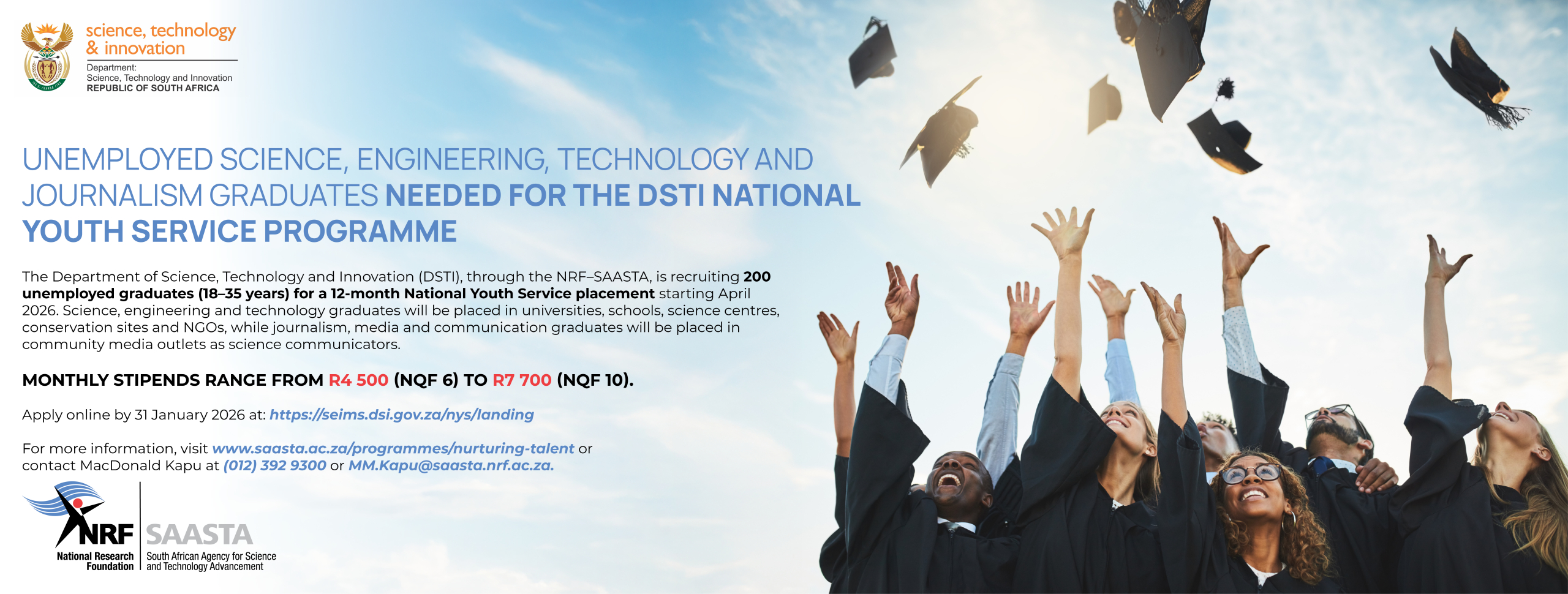 On behalf of the Department of Science, technology and Innovation (DSTI), the National Research Foundation’s South African Agency for Science and Technology Advancement (NRF-SAASTA) invites the unemployed graduates described below to participate in the DSTI-National Youth Service (NYS) programme over a 12-month period. About 200 graduates will be accommodated.